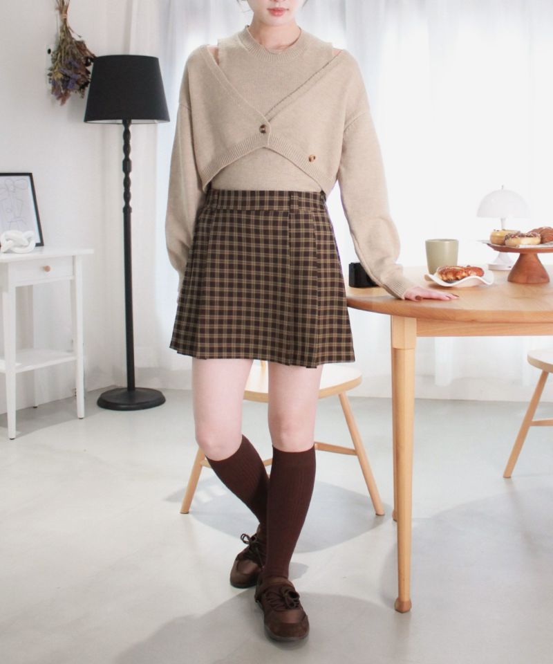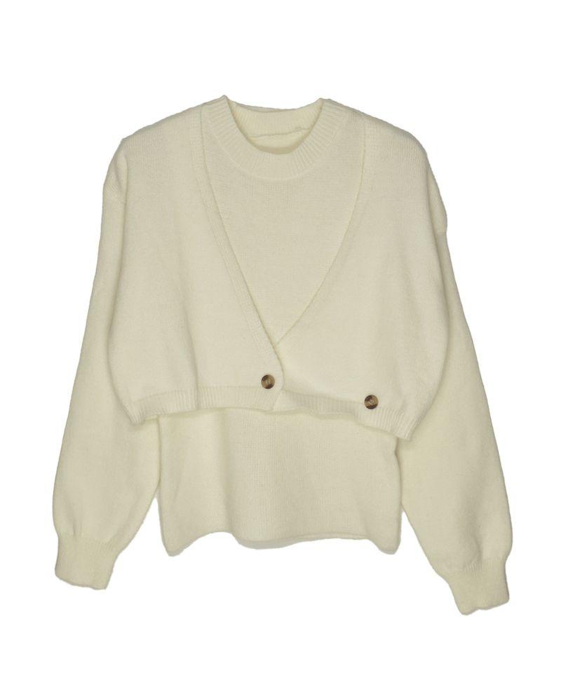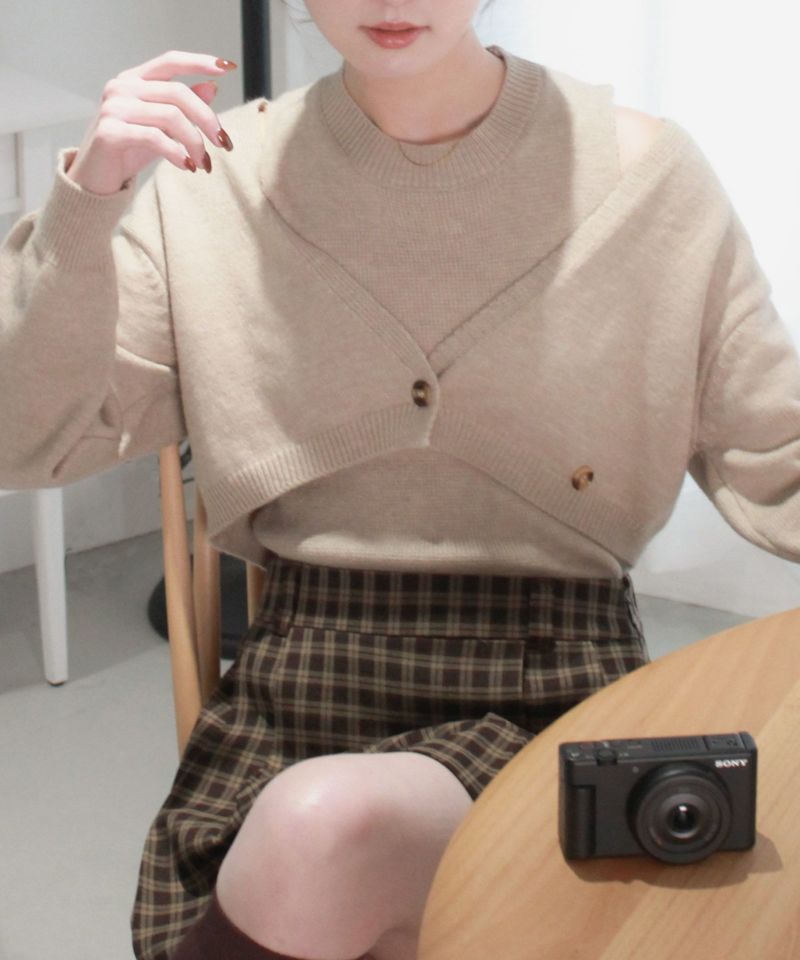ノースリーブニットとショート丈カーディガンがセットになったレイヤードデザイン。