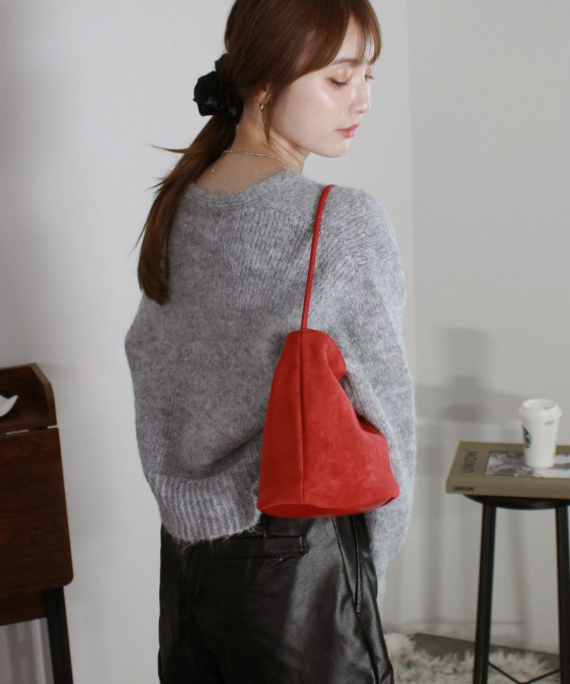 ふわっと柔らかい質感のニット素材を使用。 軽くて暖かく、やさしい肌触りが魅力です。 やや毛足のある風合いが、季節感と女性らしいやわらかさをプラスします。