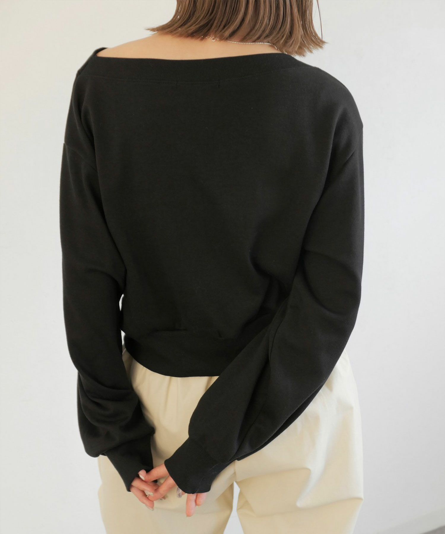 広めに開いた襟元がデコルテを美しく見せてくれる 大人のきれいめスウェット。 裾と袖口部分は広めなリブにし、 丈は短すぎず身幅はゆったりとしたサイズ感で 仕立てられたスウェットは絶妙なバランスが 美シルエットの優秀スウェット。