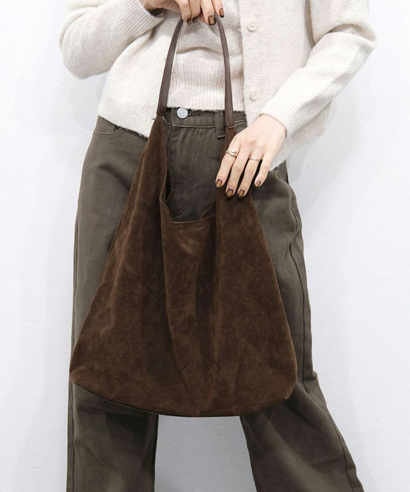 スエード生地が可愛いA4サイズ収納可能バッグ◎ 荷物が多い日でも安心な大容量バッグ。 シンプルなデザインながらトレンドのワンハンドルが可愛いアイテム。