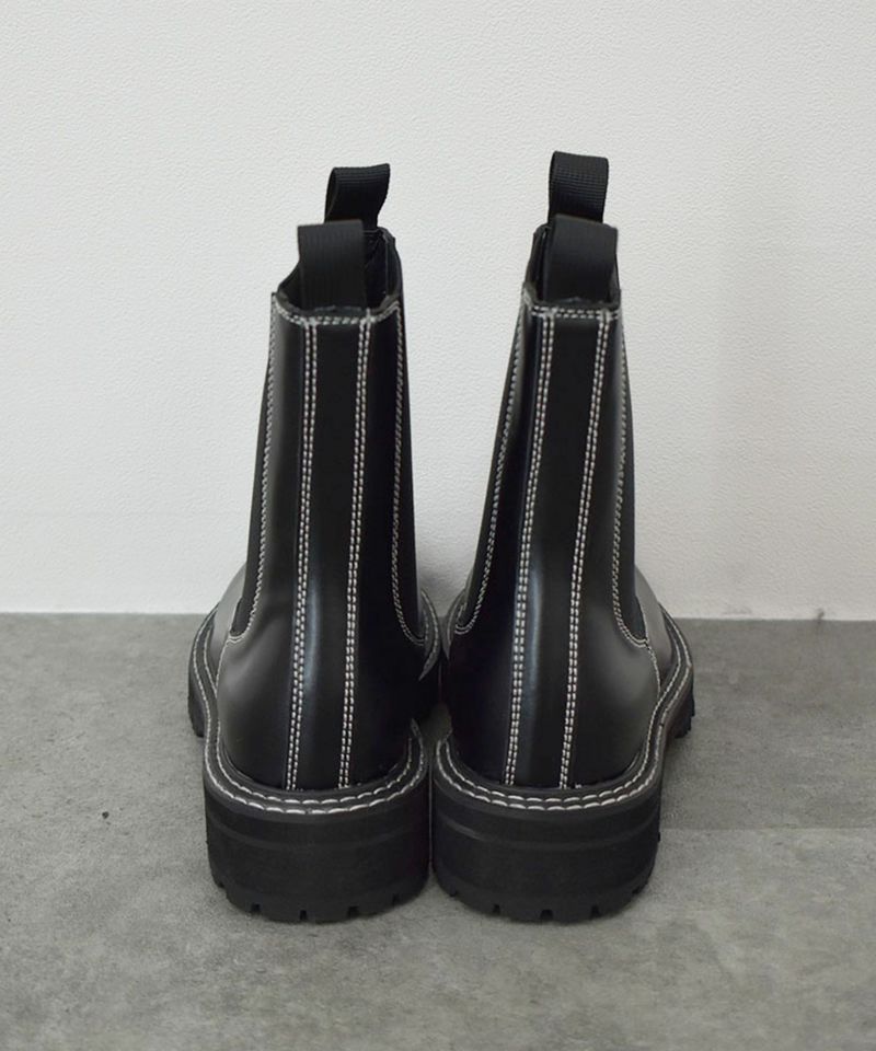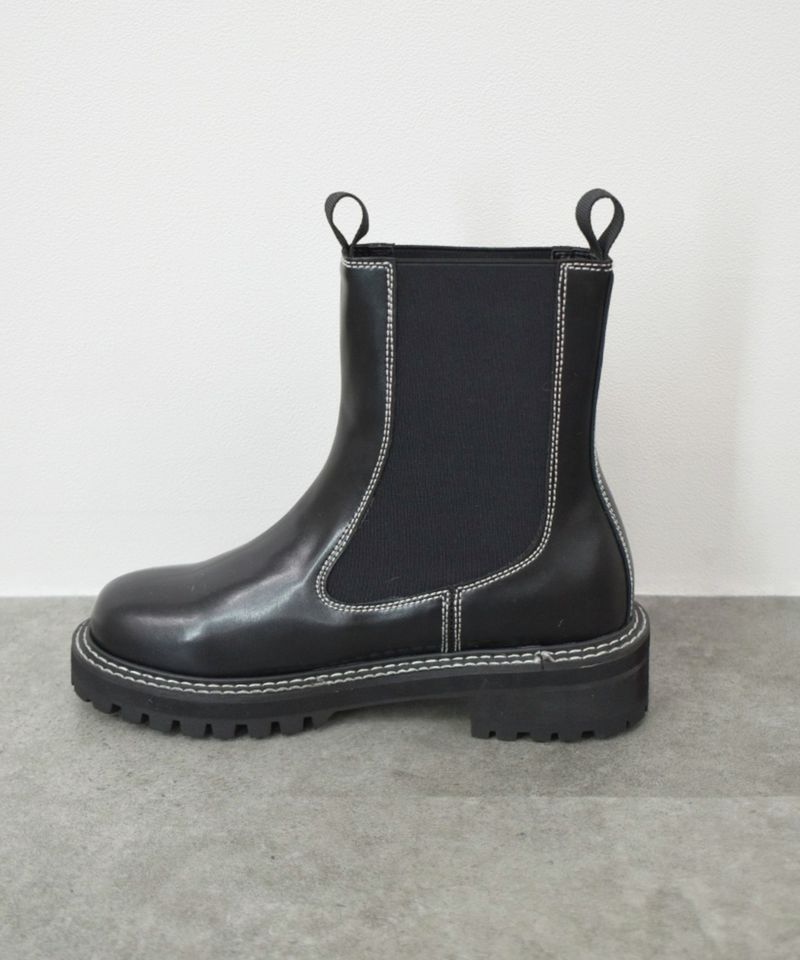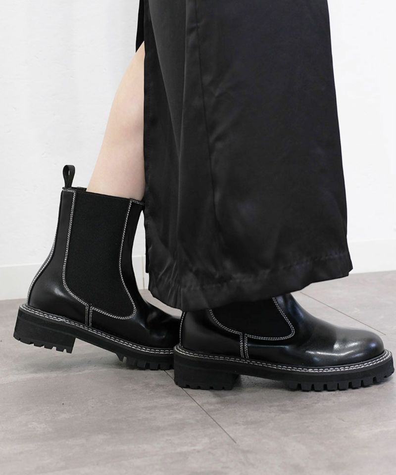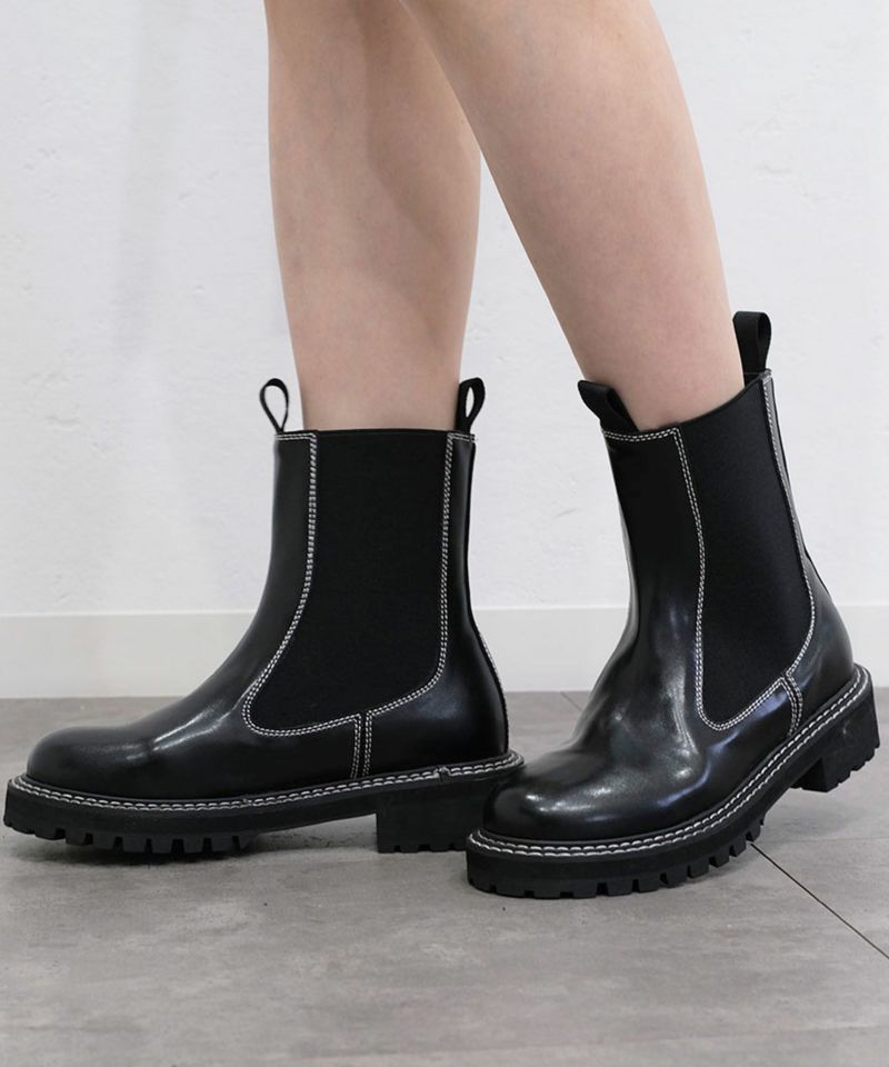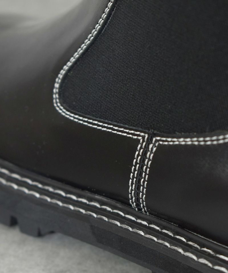 サイドゴアとバイカラーステッチがかわいいブーツ。 マット加工の施されたほんのり光沢感のある合皮のブーツ。 しっかり厚みのある生地なので形が崩れにくく 長く綺麗に履いていただけます。 さらにサイドは広い範囲でゴア仕様になっており、 着脱がしやすいのも嬉しいポイント♡