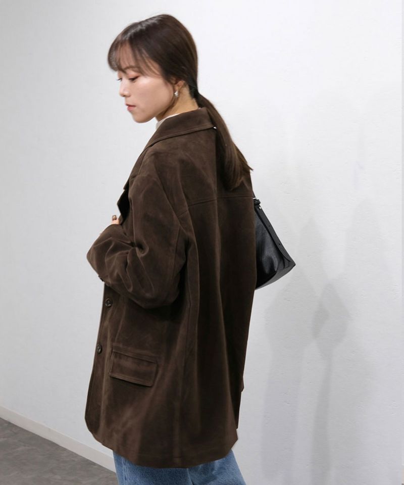 スウェード生地の高見えジャケット。 厚みとハリのある生地感で、 コーディネートに取り入れるだけで、モードカジュアルな印象に◎ 風を通しにくい素材なので、秋冬取り入れたいアイテム。