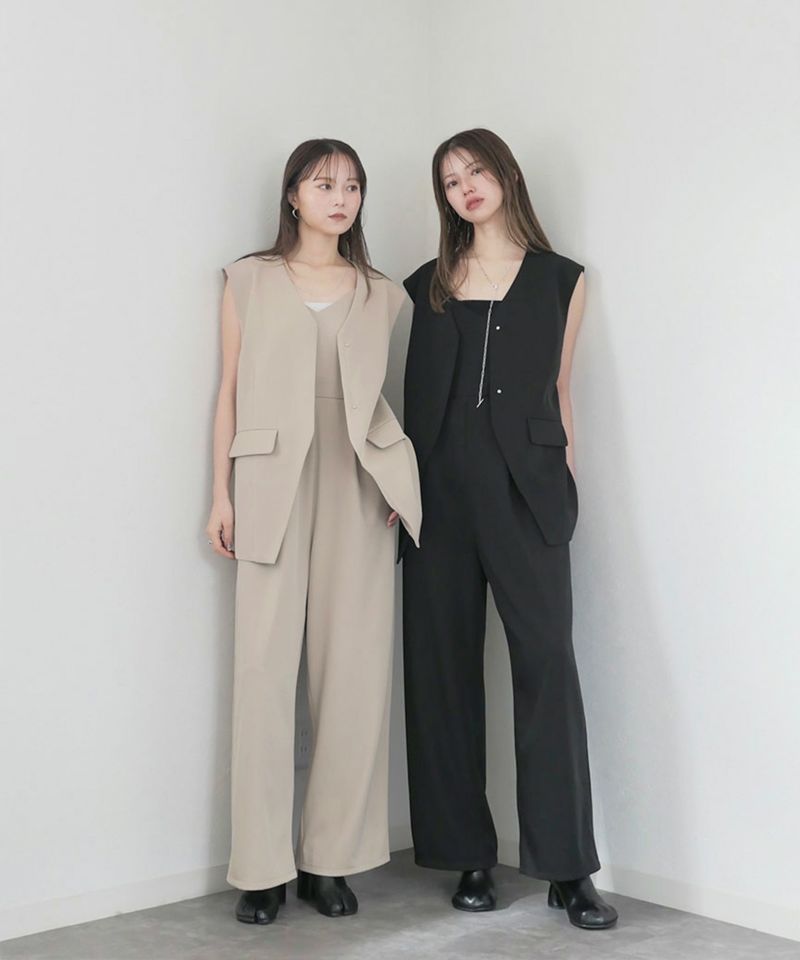 同生地のサロペットと合わせれば、セットアップ風のスタイリングも可能。