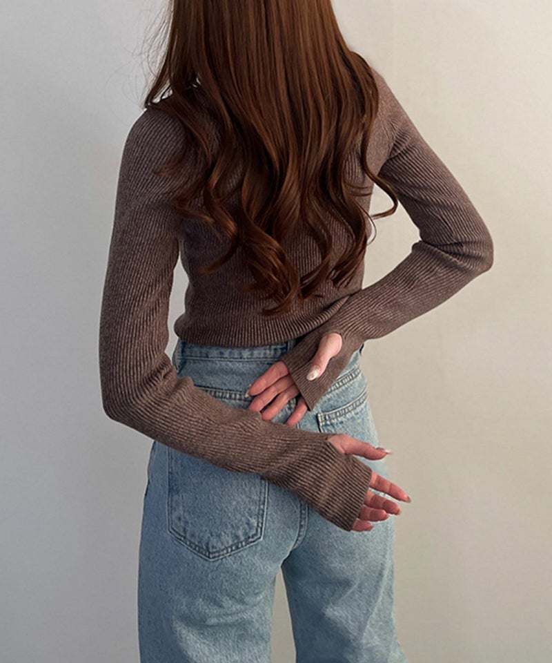 長めの袖丈にサムホールデザインを プラスした今年らしいデザインです。 カラーも単色ではなくメランジなので モードな雰囲気を楽しめます♪