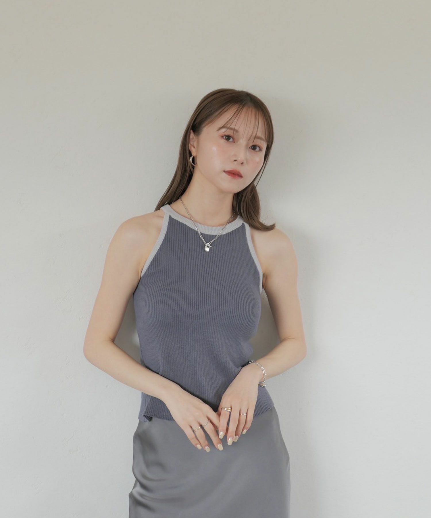 肩や顔周りを華奢みせしてくれるアメスリデザインが ヘルシーな印象のニットトップスは 配色のリブがポイントになり1枚でコーデを引き立てるアイテム。