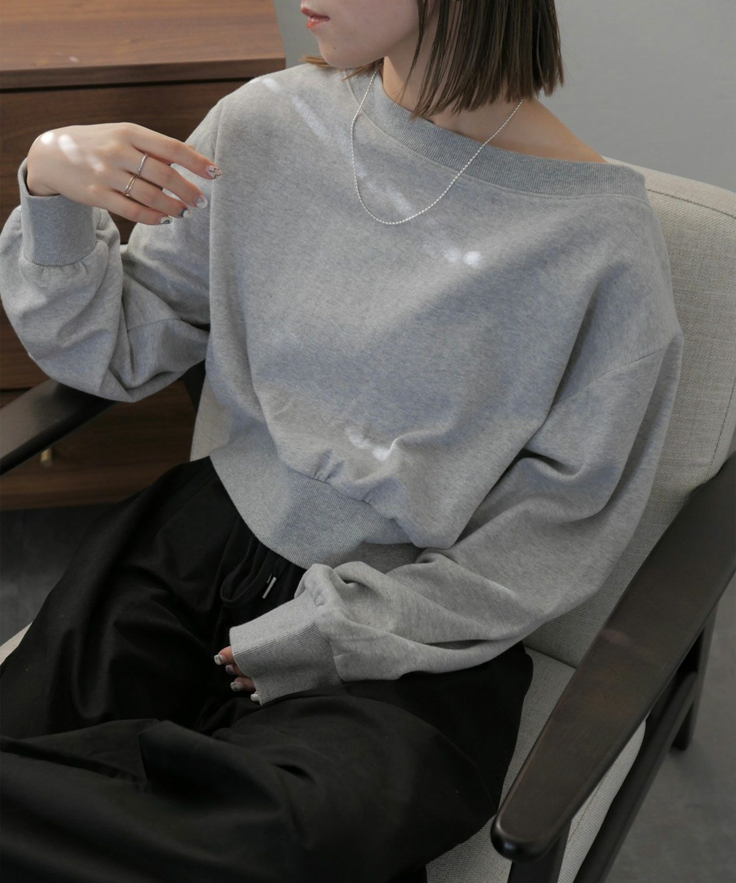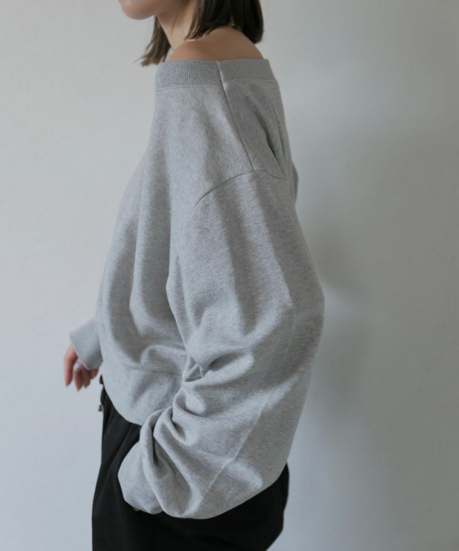広めに開いた襟元がデコルテを美しく見せてくれる 大人のきれいめスウェット。 裾と袖口部分は広めなリブにし、 丈は短すぎず身幅はゆったりとしたサイズ感で 仕立てられたスウェットは絶妙なバランスが 美シルエットの優秀スウェット。