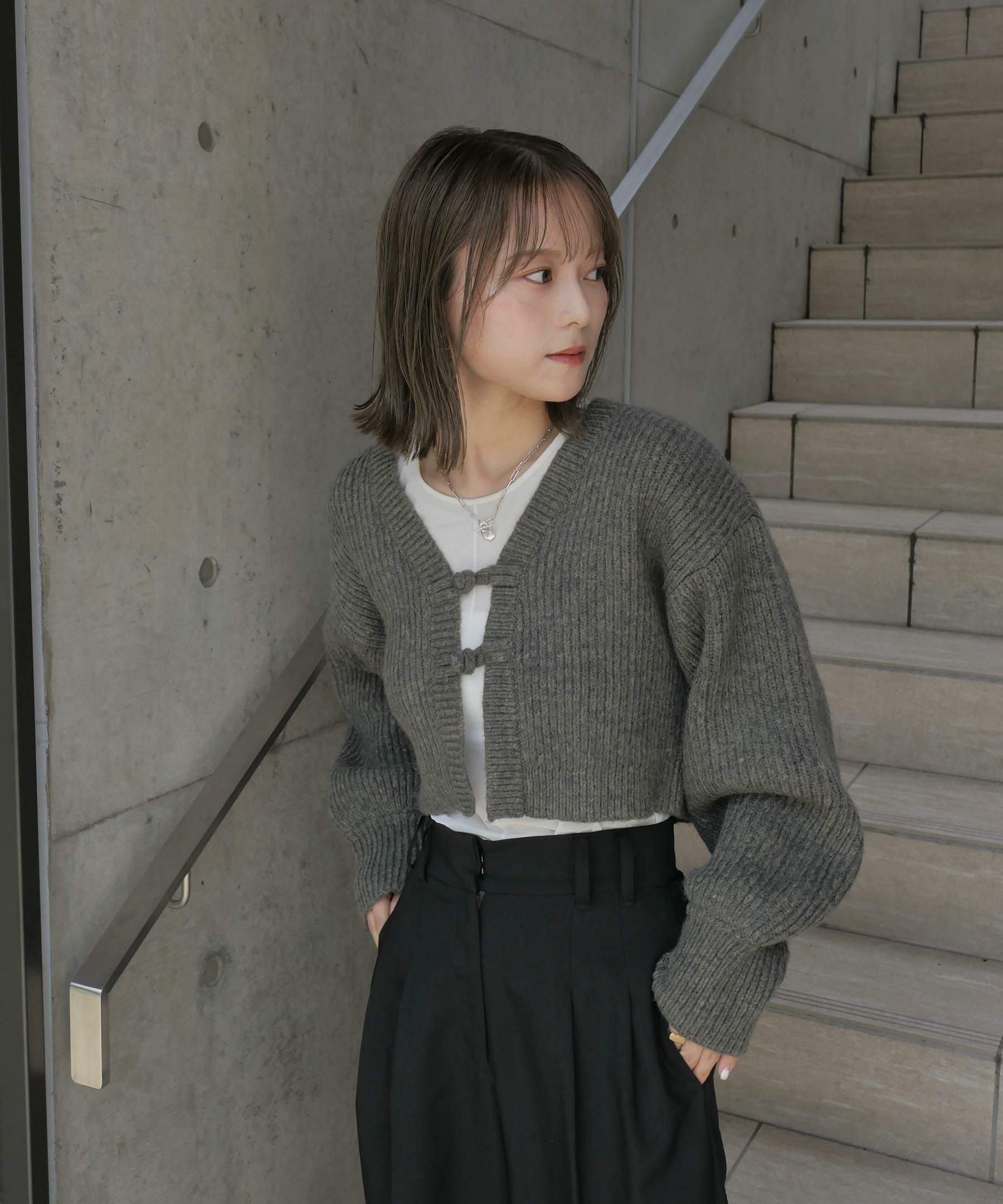 ディティールにこだわったニットボレロが登場♪ 大人気のメランジカラーのふんわり起毛糸を使用し クロップド丈×ボックスシルエットのトレンドシルエットに フロントにはチャイナボタンを2つ施しました。 たっぷりとしたボリューム袖も可愛さをUP◎