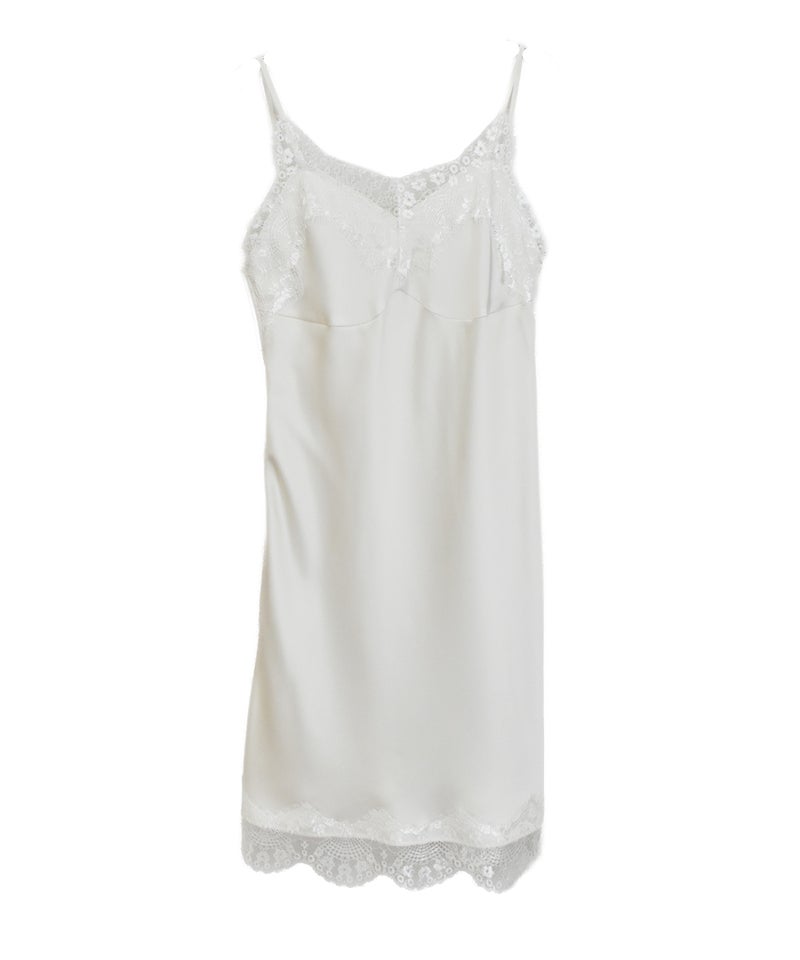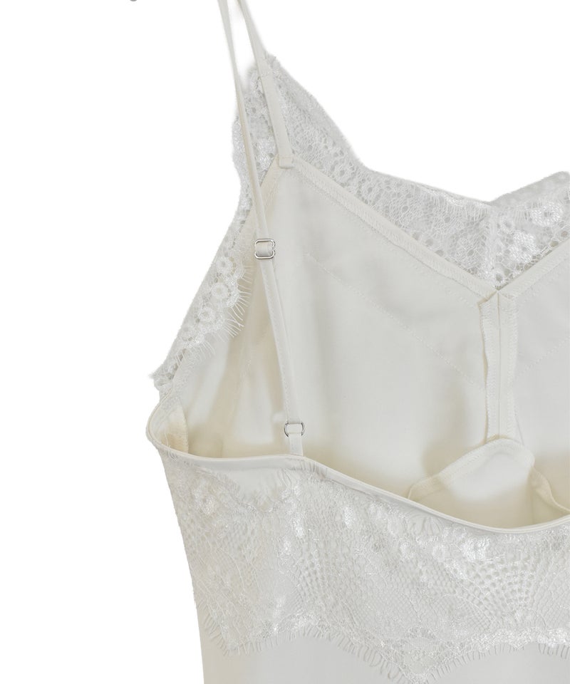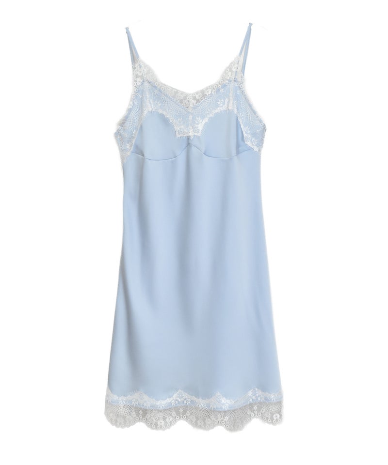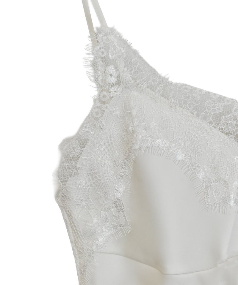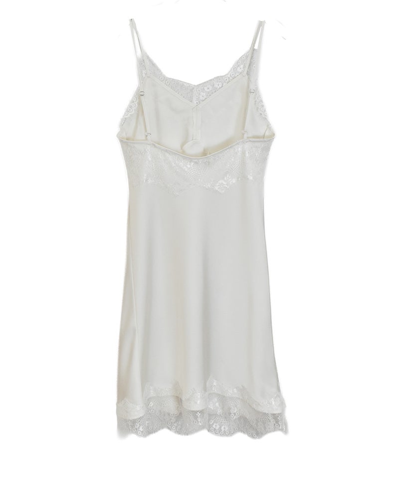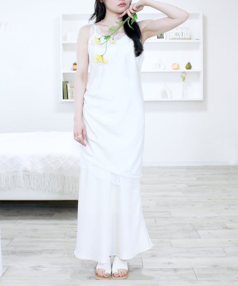 胸元と裾のレースディティールが女性らしさを引き立てるデザイン。