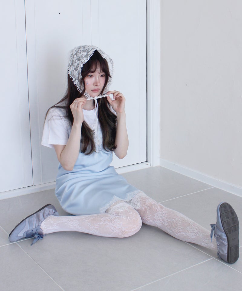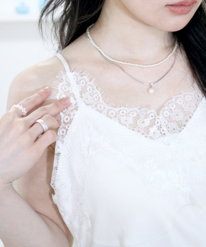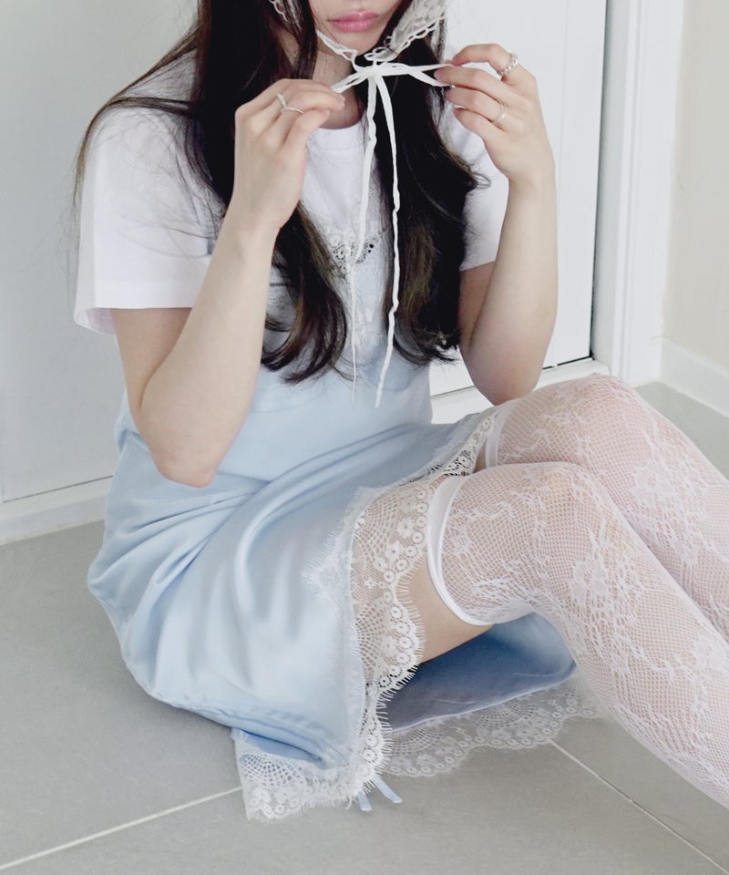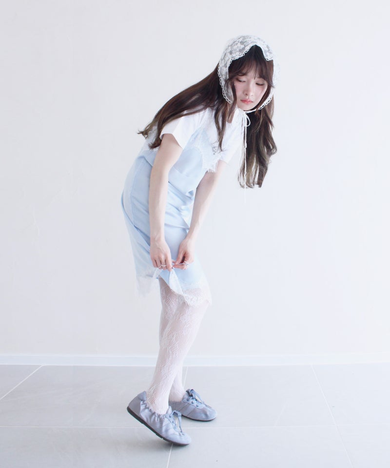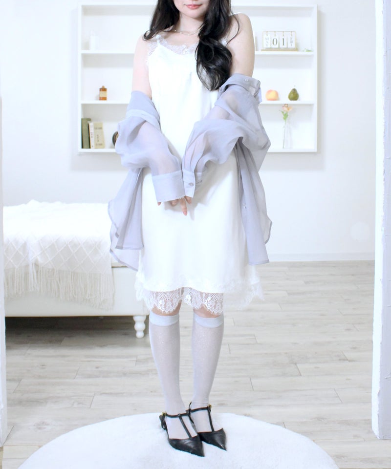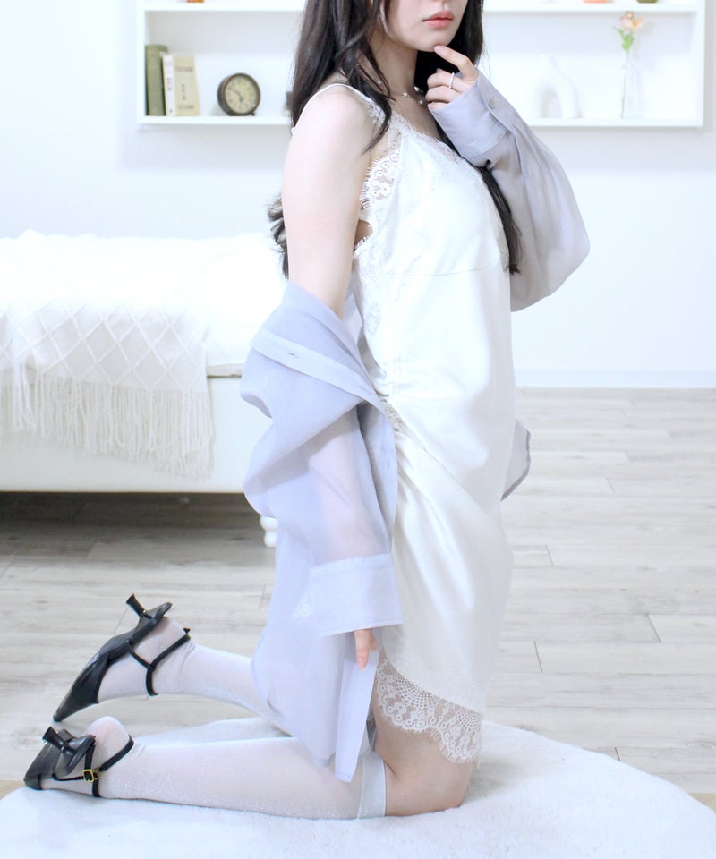 胸元と裾のレースディティールが女性らしさを引き立てるデザイン。