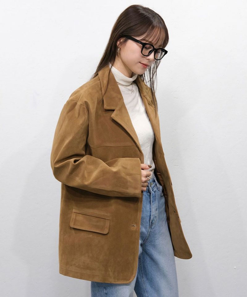 スウェード生地の高見えジャケット。 厚みとハリのある生地感で、 コーディネートに取り入れるだけで、モードカジュアルな印象に◎ 風を通しにくい素材なので、秋冬取り入れたいアイテム。