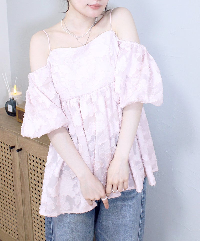 ピンクはシアー感のあるジャガード素材で、ミルキーな色味が涼しげな印象に。