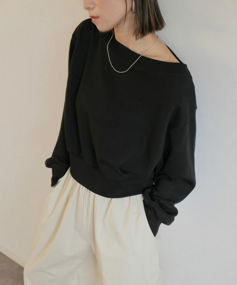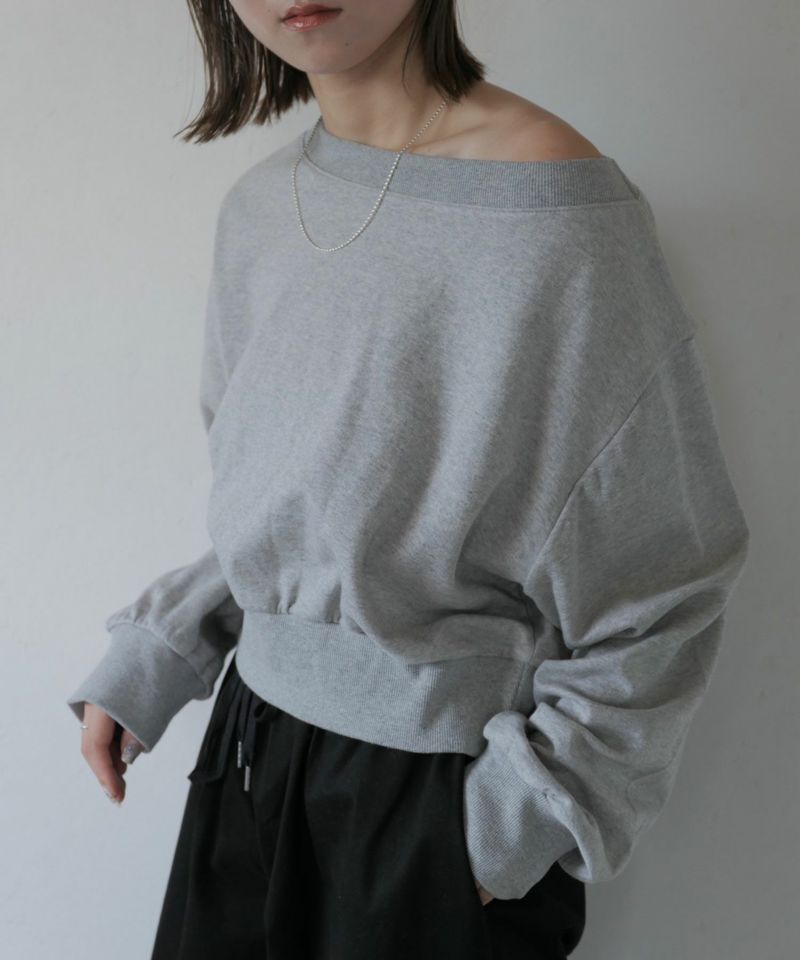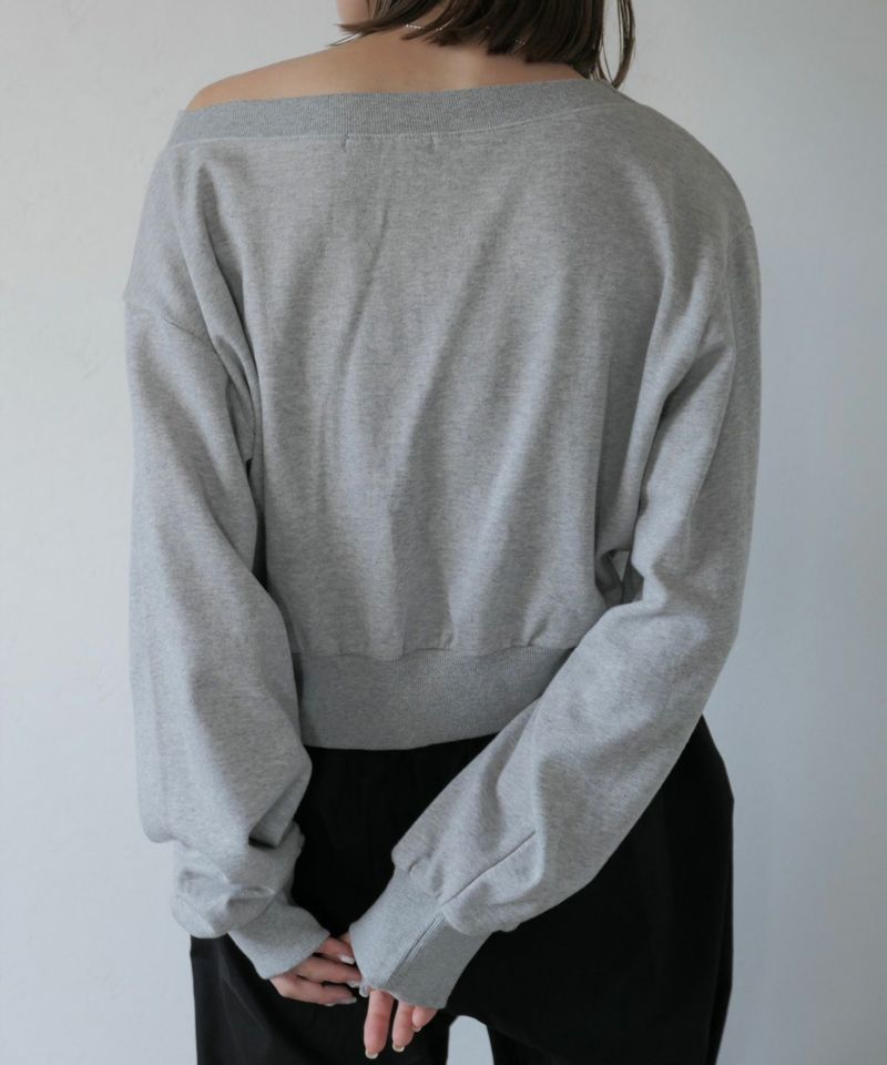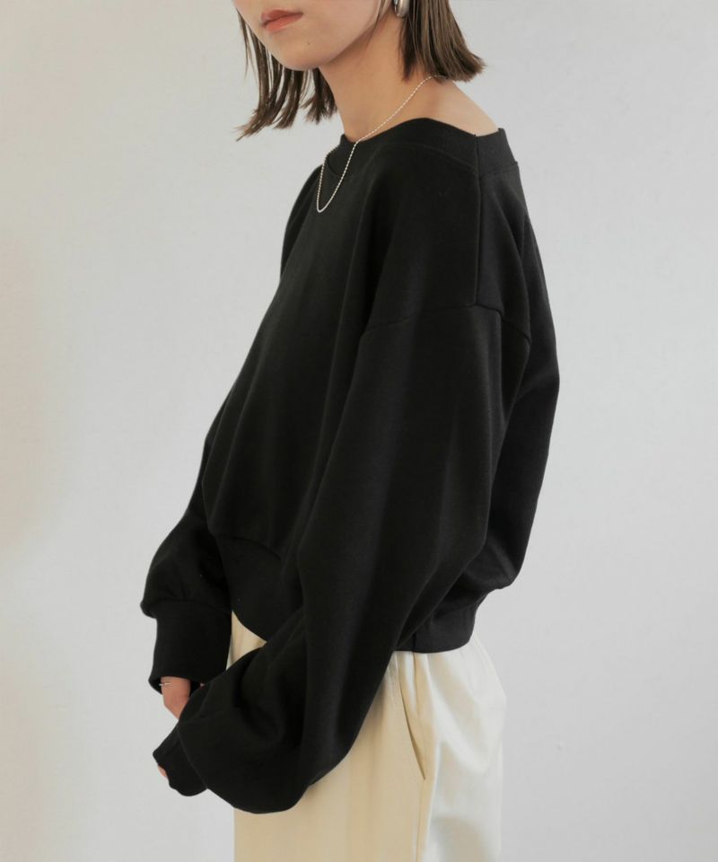 広めに開いた襟元がデコルテを美しく見せてくれる 大人のきれいめスウェット。 裾と袖口部分は広めなリブにし、 丈は短すぎず身幅はゆったりとしたサイズ感で 仕立てられたスウェットは絶妙なバランスが 美シルエットの優秀スウェット。