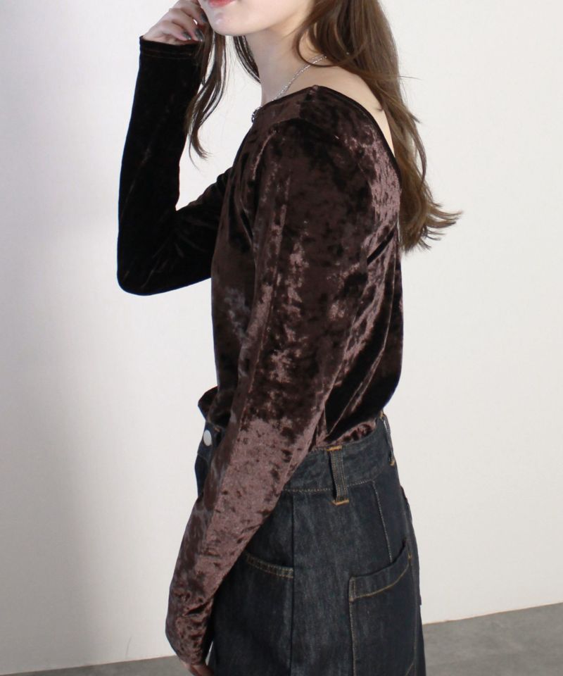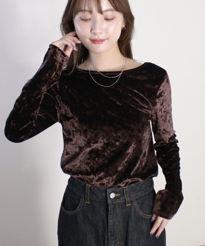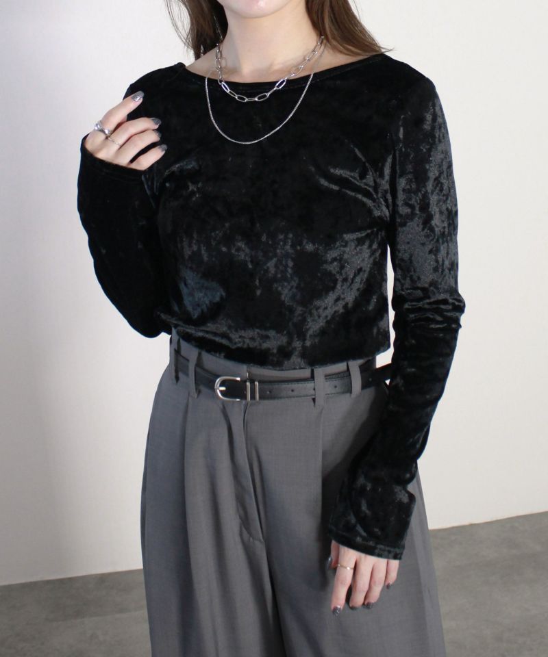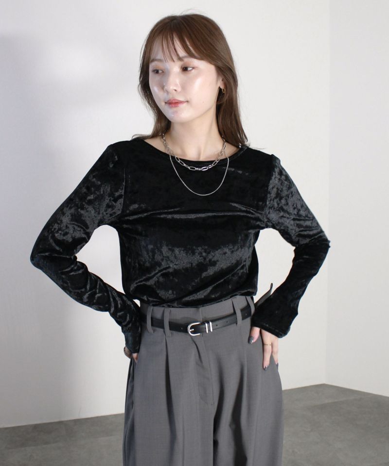 シンプルなシルエットながら、光沢感のあるベロア生地が存在感を放つ長袖トップス。