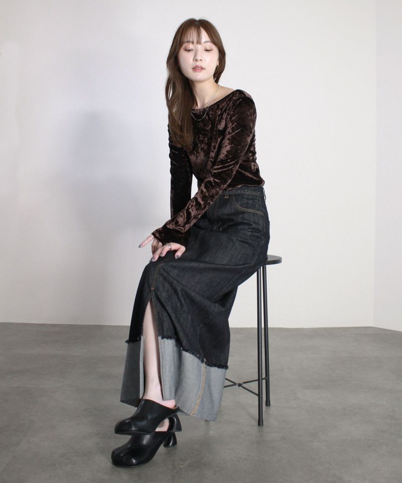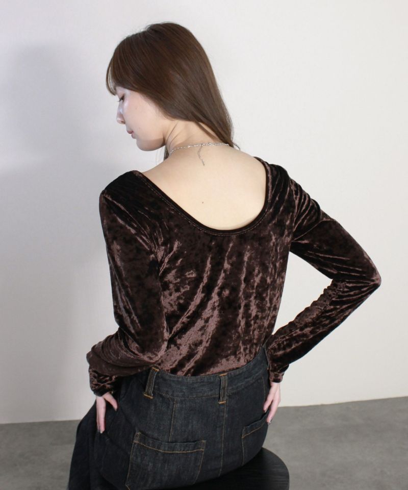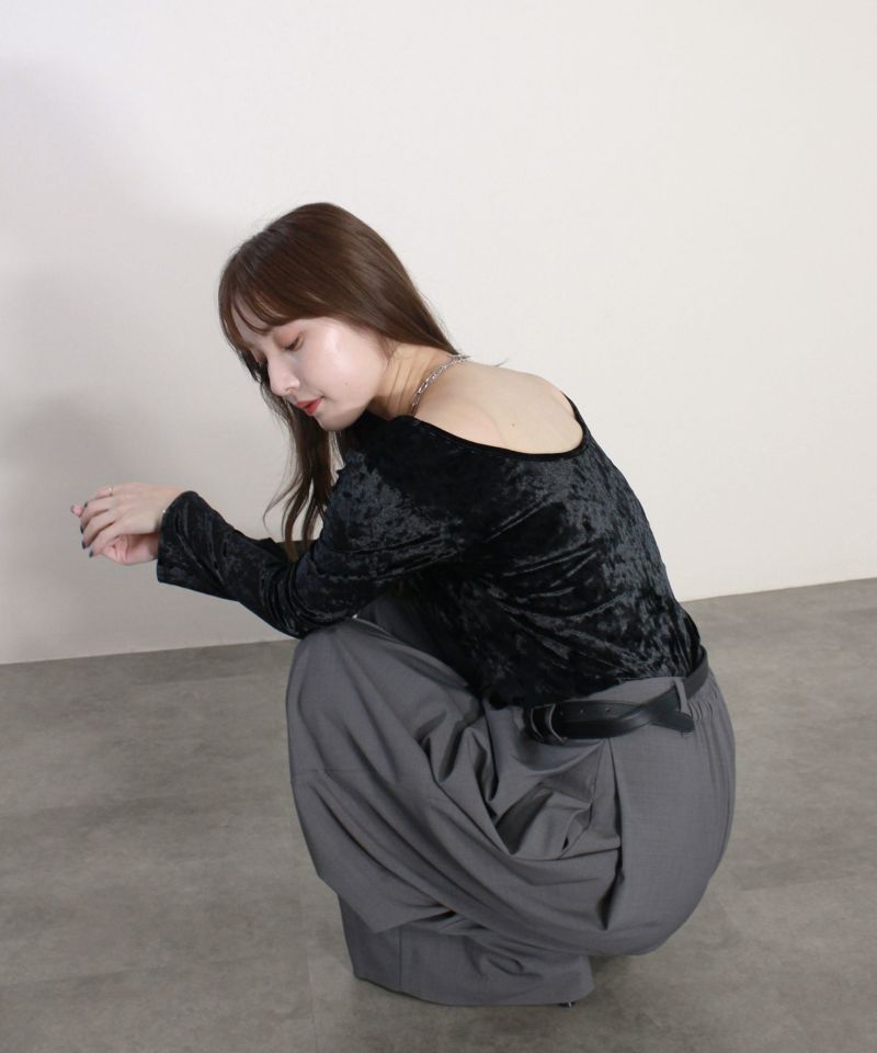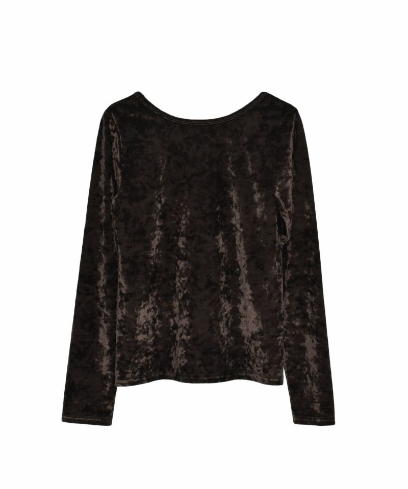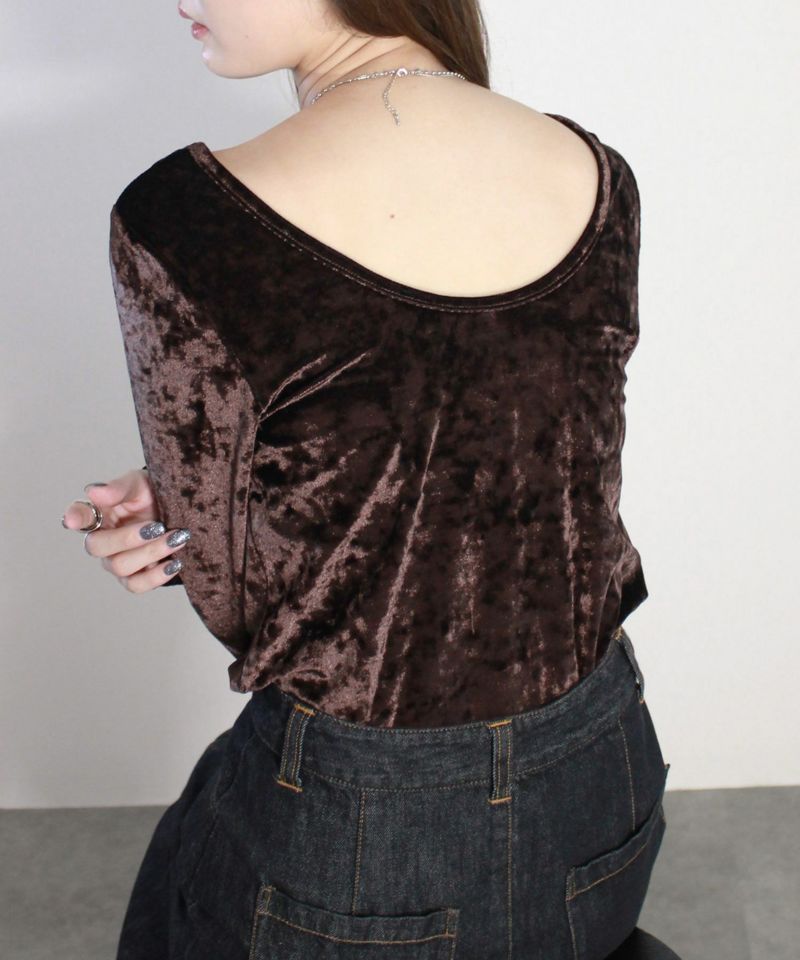 シンプルなシルエットながら、光沢感のあるベロア生地が存在感を放つ長袖トップス。